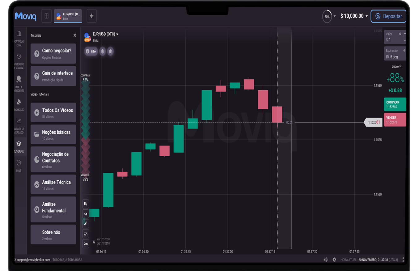 A Moviq foi feita para extrair o máximo do seu operacional: Payouts superiores e estáveis: mais retorno por operação, com transparência nas regras. OTC que respeita análise gráfica: ativos com fluidez e comportamento técnico consistente, ideais para price action, padrões e confluências. Execução rápida e sem travas: baixa latência, sem “surpresas” na hora do clique. Ambiente sério para trader sério: liquidez, estabilidade e suporte que fala a língua do trader.
